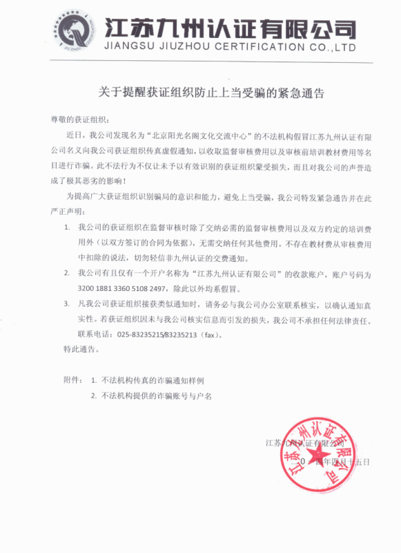 版權所有 All Rights Reserved 江蘇九州認證有限公司